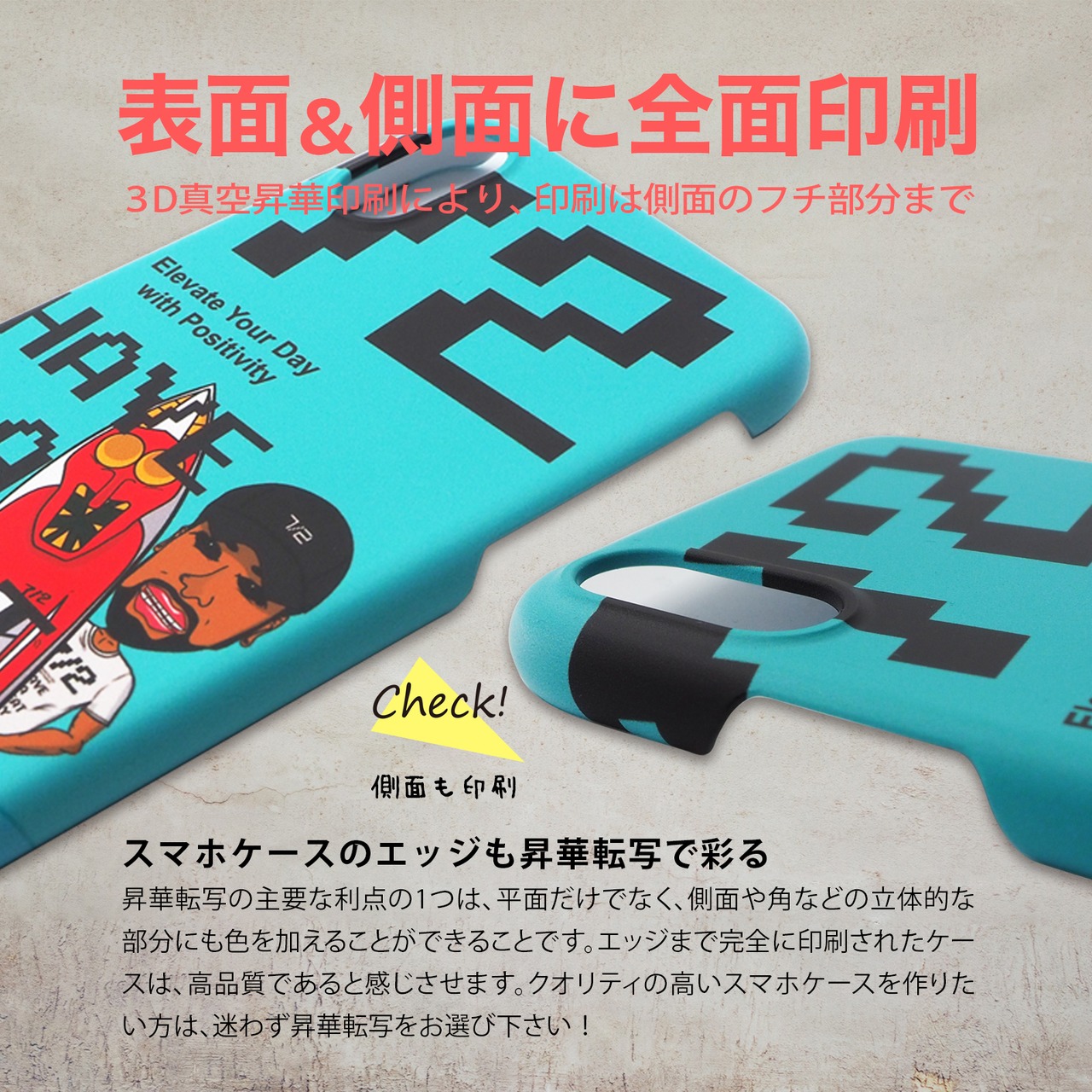 ベースとなるホワイトケースに3D真空昇華印刷で、スマホケースの側面のフチ部分までの全面印刷となります。